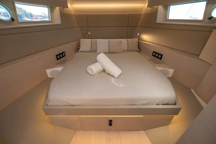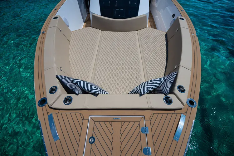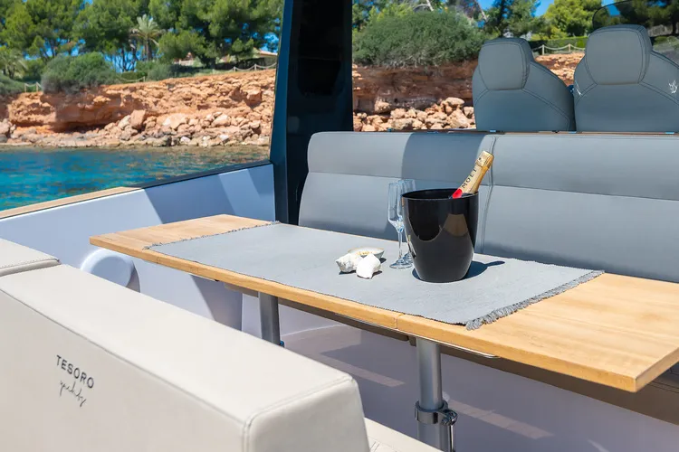 The Tesoro 40 features 2 cabins: a master cabin and a twin cabin. Its ‘Open’ design provides a spacious and elegant area, perfect for enjoying the sun and views. Additionally, it has 3 distinct areas where you can relax while cruising along Mallorca’s coast. The yacht is also equipped with a hydraulic platform to facilitate access to the water and swimming.
